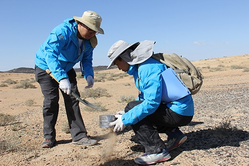 在茫茫戈壁中好不容易找到一个砂石地块,队员们立刻停下来选取样本。