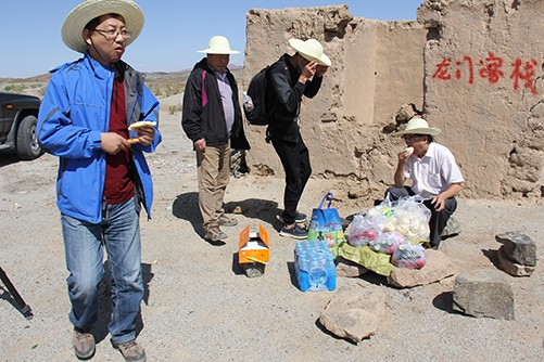 我们一行人就在这废墟般的房子边歇下来,此时已经有些饥肠辘辘了。杜泽忠博士从越野车的后备箱中拎下一大包馒头,搁在一块大石头上,还有黄瓜和西红柿,以及几包榨菜。一行二十几个人就围着大石头啃咬起来。尽管这些馒头有些干,咬到嘴里有点向外喷撒,但吃起来还蛮香的。经过一上午在汽车上的颠簸和在戈壁滩上不停地跑动,可能大家实在是饿了,居然没有一个人嫌弃这顿饭菜的质量,一个个都狼吐虎咽,咀嚼得有滋有味。