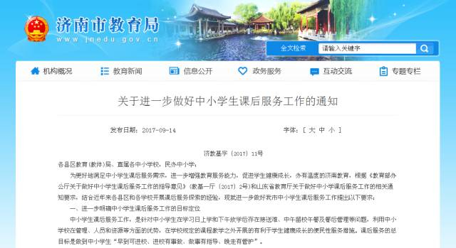 为更好地满足中小学生课后服务需求,进一步增强教育服务能力,促进学生健康成长,办有温度的济南教育,根据《教育部办公厅关于做好中小学生课后服务工作的指导意见》(教基一厅〔2017〕2号)和山东省教育厅关于做好中小学课后服务工作的相关通知要求,结合近年来各县区和各学校开展课后服务探索的经验,现就进一步做好我市中小学生课后服务工作提出以下要求: