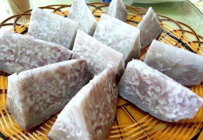 荔浦芋头,国家地理标志产品,它属于槟榔芋的一种,芋肉布满细小的红筋,无论大小都是纺锤形状。尽管槟榔芋各地都有,但荔浦芋因为口感太好,往往都会被单拎出来额外赞美一番,简直是个万年的三好学生。