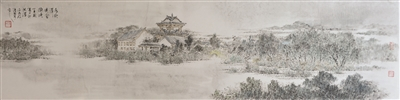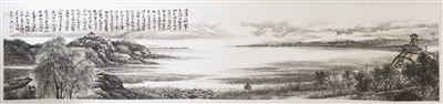 有道家名山美誉的老子山、堪比“水上长城”洪泽湖大堤、千里淮河第一闸三河闸、集人文景观与自然鬼斧于一身的水釜城、充满现代气息的居民区——庞康的两幅长卷首尾相连,形成了一幅气势磅礴的洪泽全景图。