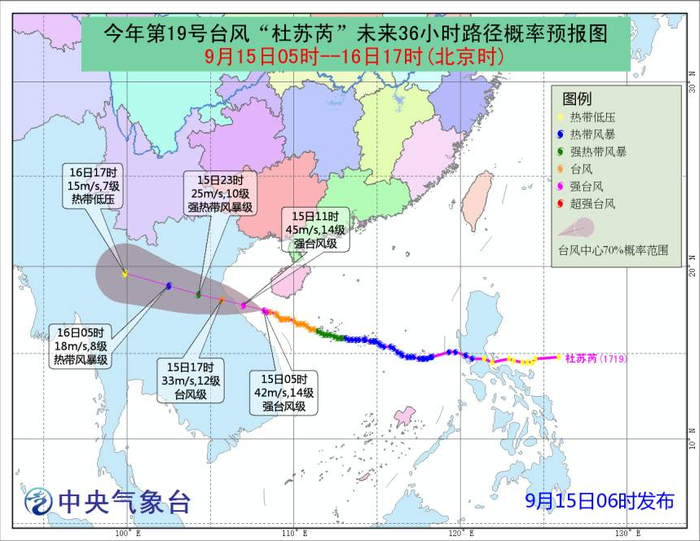 预计,15日08时到16日08时,广东西部沿海、海南沿海、广西沿海、琼州海峡、北部湾、南海西部将有7-9级大风,其中海南西南部沿海、南海西北部和中西部以及北部湾南部的部分海域风力可达10-12级,“杜苏芮”中心经过的附近海域风力可达13-14级,阵风15-16级 ,中央气象台15日06时继续发布台风橙色预警。