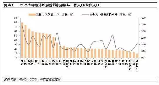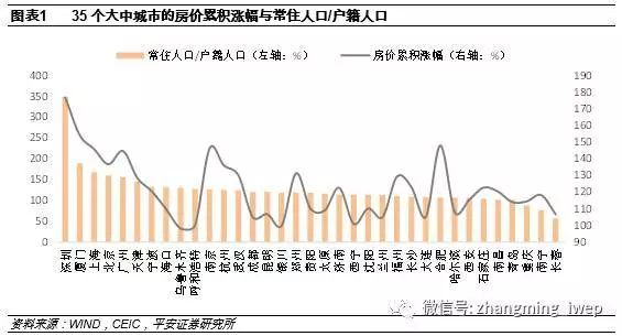 房价的上涨幅度与该地区常住人口/户籍人口的比例具有明显的正相关关系。