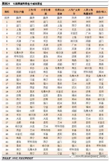 我们对每一个指标下城市的排名进行打分,然后给每一个指标赋予相同权重,加总七个指标每个城市的得分进行排序如下表。这反映的是这些城市房价受到房价驱动因素基本面支撑的强弱程度。