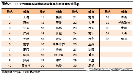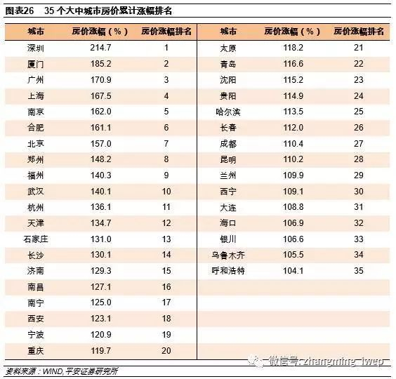 其次,我们通过房价累计涨幅排名,以筛选出近年来房价表现良好的“绩优股”。具体来说,我们选取35个城市中在过去两轮房地产周期中,也即自2012年7月以来的房价累计涨幅进行排名,得出结果如下表所示: