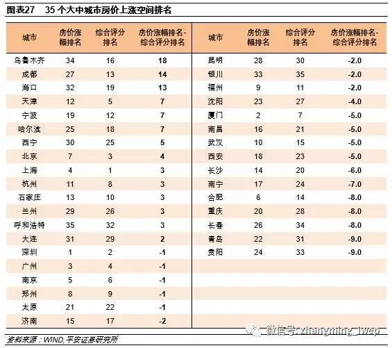 再次,我们通过对比房价累计涨幅与该城市房地产基本面的强弱,来筛选未来房价仍有上涨空间的“潜力股”。我们将过去两轮周期中35个大中城市的房价累计涨幅排名,与各个城市房地产基本面排名两者计算差值,试图得到那些基本面排名比较靠前,但房价涨幅相对靠后的城市,也即房价仍有上涨潜力的城市排名。