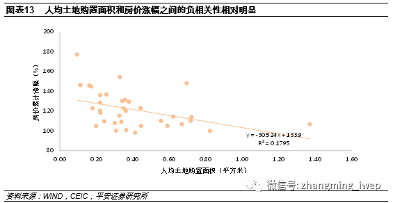 人均土地购置面积与房价涨幅具有显著的负相关性。35个大中城市的平均人均土地购置面积为0.4平方米,房价涨幅较高的城市,如深圳,南京,上海等城市的人均土地购置面积远远低于该水平。