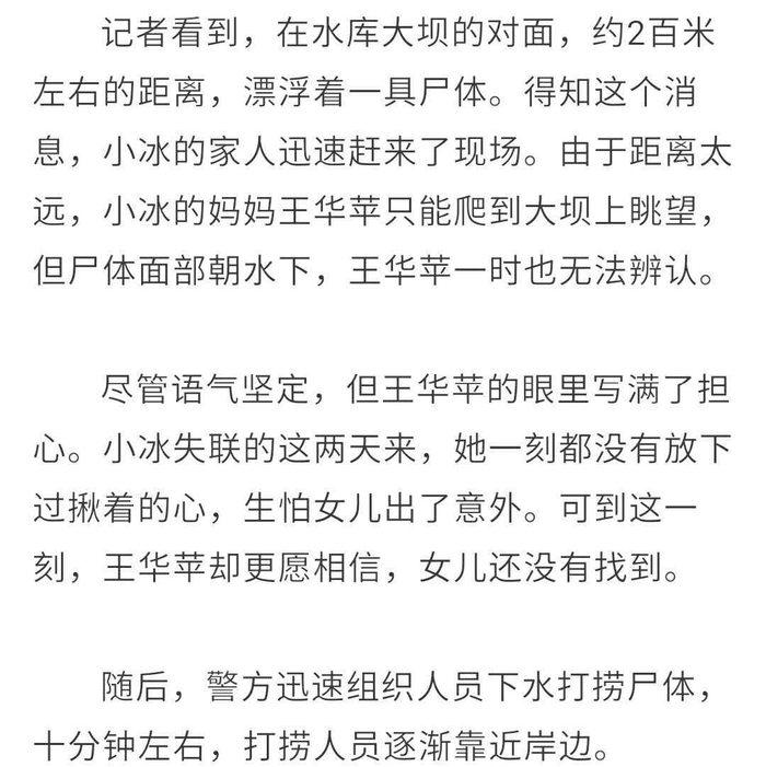 节目播出前,小冰的母亲王华苹给记者打来电话说,就在水库附近的香蕉林里,找到了小冰的校服裤子和白色上衣。那么,死者究竟是不是小冰?接下来我们也会继续关注。