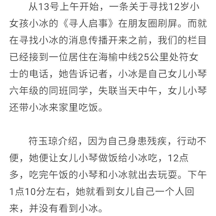 最近海口遵谭镇12岁小女孩小冰失踪的事