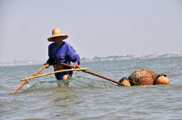 记者在现场看到,海水越来越深,已经没到杜光忠的腹部,只见他取下随身携带的高跷,先将右脚踏在中间的踏板上,用绑腿固定住,然后一边跳着平衡身体,一边再固定左边的高跷,动作相当熟练,整个绑高跷的过程不过几分钟。“有了这个,就可以继续向深海区前进了。”杜光忠一边说着,一边继续重复推虾的动作。在一米半深的海水里,他上半身露在外面,形象显得格外高大,与远处没踩高跷只露着头部的渔民形成鲜明对比。