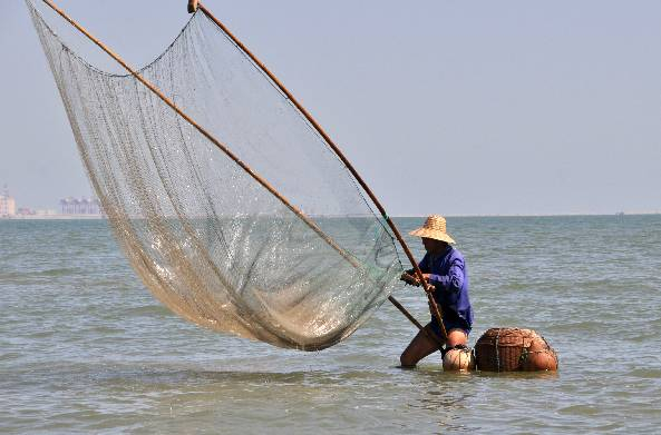 来到海水荡漾处,杜光忠停下脚步,将一个长方形的顶杆子拴在腰上,然后将两边拴着大长竹竿的渔网铺在海面上,用顶杆子顶着渔网顶端的竹竿头儿,后面拖着竹篓,这样整个渔网就像张开双臂的人一样,迎着潮流向深海走去。在这个过程中,会不断有小虾被渔网兜住,每过一段时间,杜光忠就慢慢抬起渔网,像晃动簸箕一样把小虾聚拢到身前,再颠进瓢中,然后倒入身边的竹篓里。
