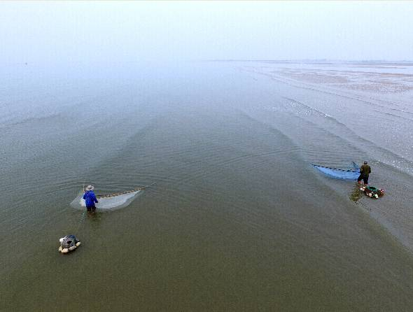 俯拍渔民推虾场景。