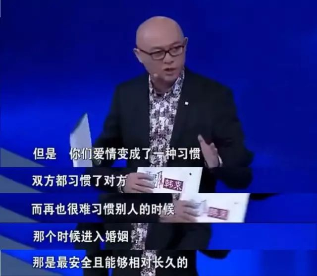 他说:结婚这件事,里边一定要有爱,没有爱是不行的。但是我认为,结婚不能仅仅是因为爱,更重要的是因为习惯。