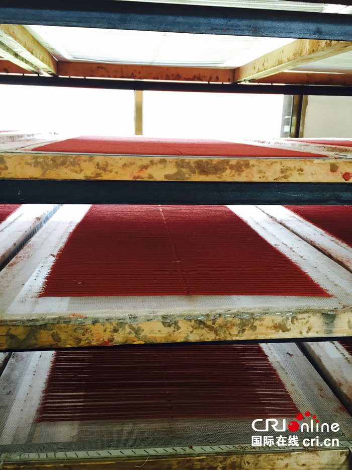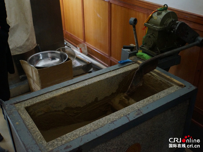 工人用钻孔的牛角将研磨熬制好的香泥挤成条儿