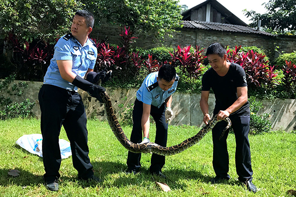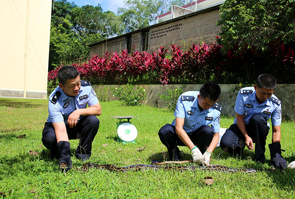 9月12日,经民警和野生动物保护站技术人员现场检查和鉴定,这是一条国家一级保护野生动物“缅甸蟒”,身长2.6米、体重7千克,身体无外伤,体征正常,身体非常健康。
