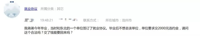 我弟弟今年毕业,当时和东北的一个单位签订了就业协议。毕业后不想去该单位,单位要求交2000元违约金,请问这个合法吗?交了钱能要回来吗?