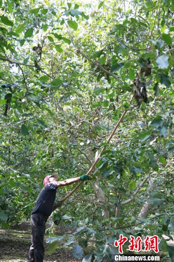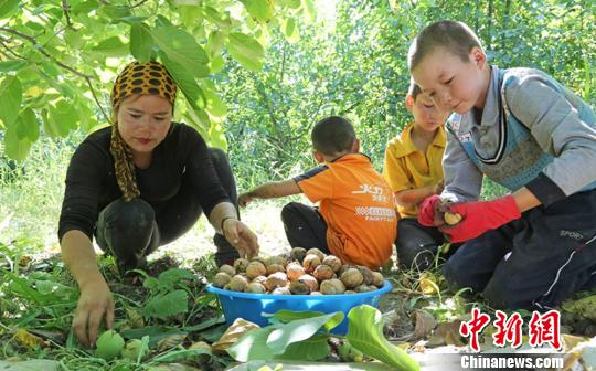 中新网阿克苏9月15日电 (耿丹丹)每年9月,正值新疆核桃采摘季,在塔克拉玛干沙漠边缘的阿克苏地区温宿县柯柯牙管理区果林新村的一片核桃林中,农民赵武忠的36亩核桃长势喜人,他在核桃地里边忙活边说,“今年又是一个丰收年”。