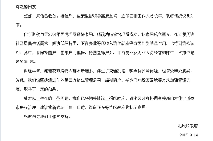 北辰区政府回复:佳宁道夜市于2004年因清理辰昌路市场,经疏堵结合治理后成立。该市场成立至今,在方便周边社区居民生活需求、解决低保特困、下岗失业等低收入群体就业等方面起到明显作用,也得到群众认可。其中,低保特困户、困难户(低保、特困边缘户)、下岗失业及无业人员经营的摊位,占摊位总数的31.2%。