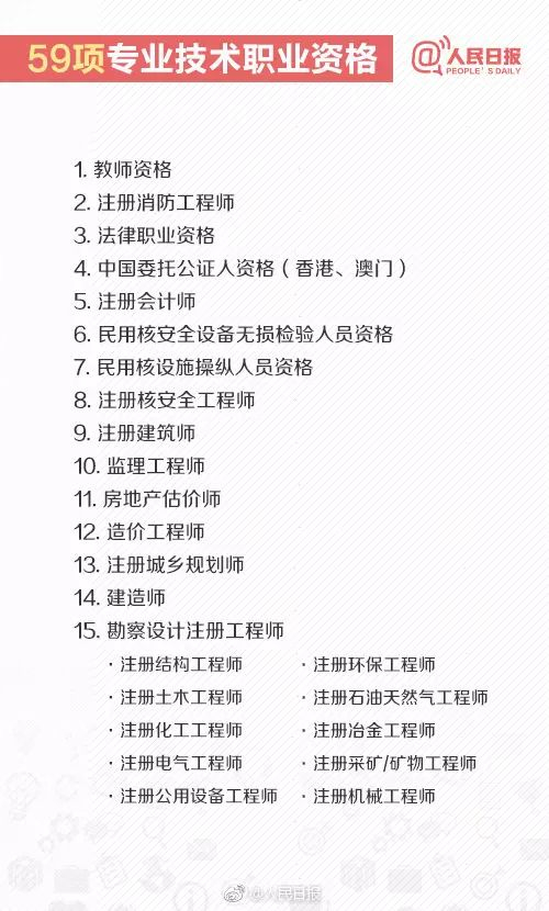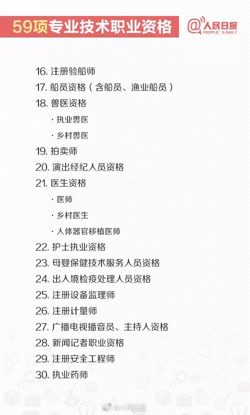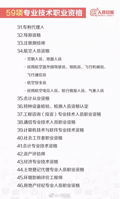 此次,公布的国家职业资格目录共计140项职业资格中,专业技术人员职业资格59项,含准入类36项,水平评价类23项;技能人员职业资格81项,含准入类5项,水平评价类76项。