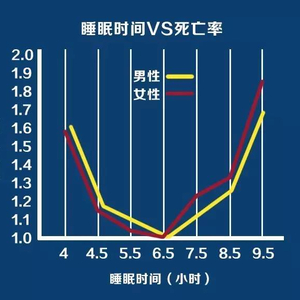 从图片中我们可以看出:睡眠时间在 5.5~7.4 小时之间,死亡率最低;少于 4.4 小时或高于 9.5 小时,死亡危险率会翻倍增高。