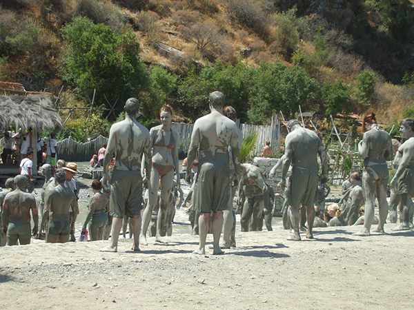 与其说是洗澡,不如说满足了成年人玩泥巴的童年幻想。一个像足球场那般大小的池子里挤满了泥浆人,看起来就像一只只复活的秦朝兵马俑。换上泳装我们便下了池子,“好滑!”混合着泥浆和石头的池底比我想像中滑腻许多,令我有种寸步难行的感觉,不过,在这么热的天气里,踩在冰凉的泥浆水里,感觉还是非常舒服的。