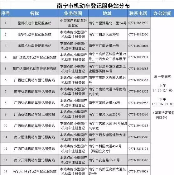 除车管所所部、邕宾、仙葫、华南城工作站外,其他7个工作站点和14个机动车登记服务站正常上班办理机动车登记业务。