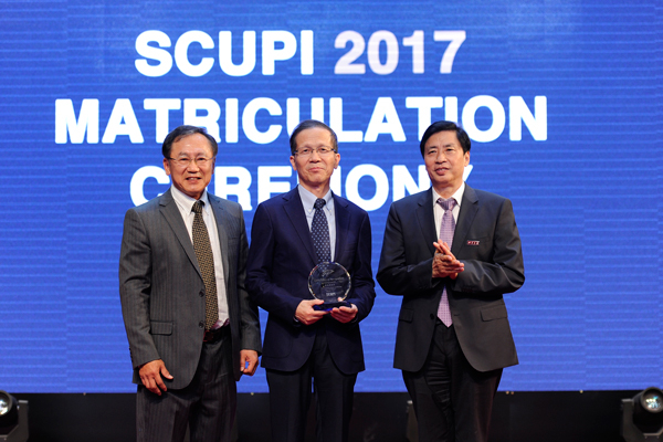 典礼上,八名新生代表上台在入学承诺书上签字,并带领全体同学进行诚信宣誓。邱民京代表四川大学匹兹堡学院向2017级同学表示欢迎,并宣读了2016级奖学金表彰名单。与会嘉宾分别向获得“最佳学术成就奖“、“学术之星”和“院长荣誉奖”的同学颁发奖杯和证书。同时,学院今年特别向原常务副校长、匹兹堡学院总监李光宪颁发了杰出贡献奖,以表彰和感谢他对学院发展做出的特殊贡献。