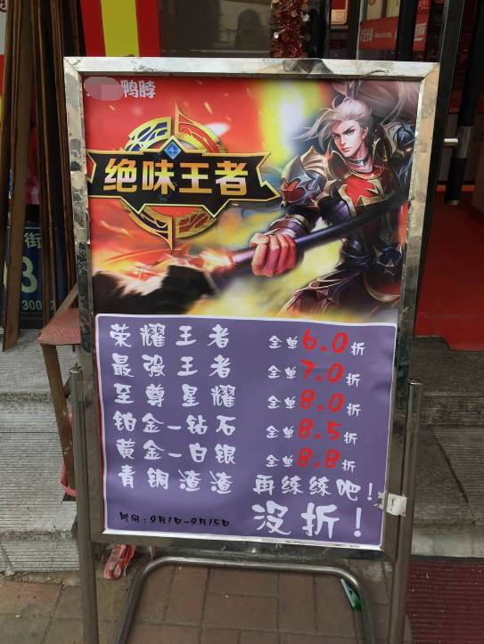 刘先生称,他知道这与当下非常流行的手机游戏王者荣耀有关,但并没有玩过,因此看到这样的优惠广告有些疑惑。“真是感觉落伍了,根本看不懂上面写的啥东西,但是觉得还挺有意思,我看周围不少年轻人都会驻足观望。”