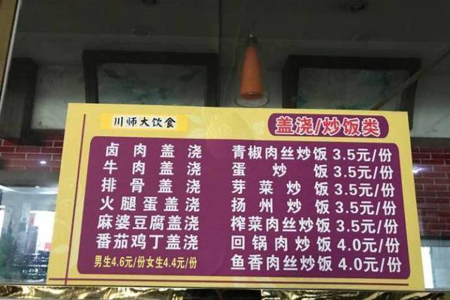 川师大的食堂不仅价格便宜,还根据男生和女生的不同饭量分开来计算。一份盖浇饭,男生4.6元,女生只要4.4元。