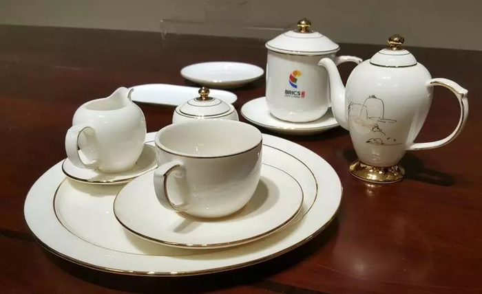 德化产的绘有金砖会标的3500件迎宾会议杯也在会议中使用。