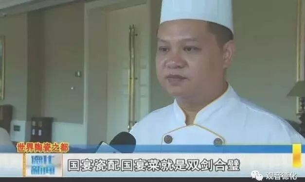 厦门海悦山庄酒店行政总厨刘景文介绍,德化白玉底,配合专门精选的食材,色彩搭配更好,摆盘更显大气。碟子与菜品的配合天衣无缝,国宴瓷配国宴菜就是双剑合璧。
