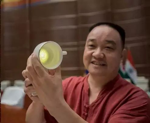 值得一提的是,在元首杯的杯底,采用阴阳双面精雕的专利技术,空杯时,是一朵象征荣华富贵的国花白牡丹栩栩如生;透光时,手指按住花蕊,它又是一朵红牡丹,粉嫩可爱、妙趣横生;手机拍摄时,这个牡丹花就变成绿牡丹;加入水后,却是一朵黑牡丹。这种独具特色的釉下彩金线写意画,独树一帜。
