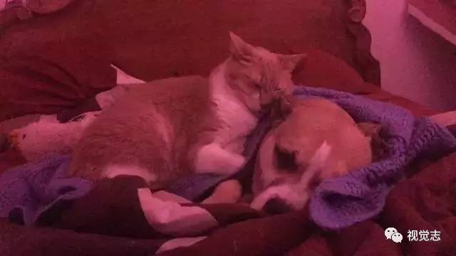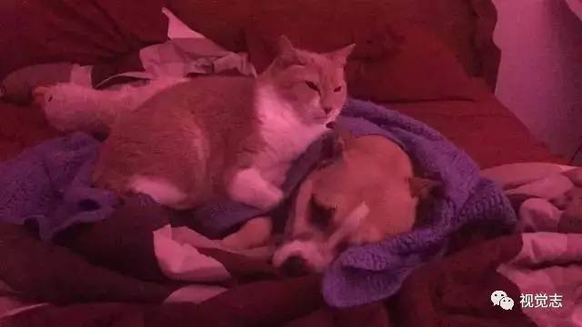 这时,家里的小猫走到狗狗身边,