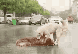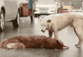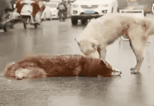 狗狗舍命相救,想把伙伴拖到路边。