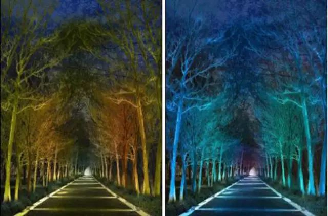 看到这,大家应该能发现,此次改造的路灯不止拘泥于单调的黄白色,彩色投光灯的引入,让绿道和两边的树木呈现不同颜色,营造如梦如幻般的感觉。此外,彩色投光灯最大的特点就是能让灯光的颜色根据四季变化依次更替为昡绿、夏蓝、秋黄、冬白,产生不同的颜色效果。