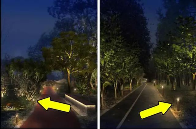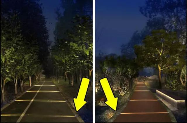 与草坪灯不同的是,地埋投射灯可以说是与地面零接触的一种灯了。它们距离更近,在绿道两侧每隔三米就能看到一盏地埋投射灯,两边对称布置,为较短较窄的路面营造唯美的灯光景色。