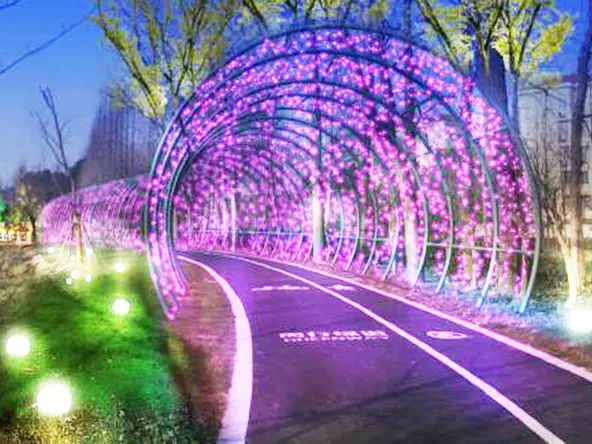 夜色中的紫藤长廊布满了紫色星光灯,以紫色为主题,与紫藤花同色,宛如一条时空隧道,加上两侧草丛堆里布满的球泡灯,更多了一种神秘的味道。