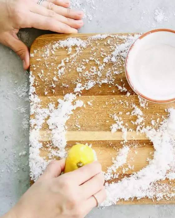 如果菜板上有顽固的油污和陈年污渍,普通洗涤剂很难洗掉。可将食盐撒在菜板上,切半颗柠檬,用柠檬蘸盐擦拭菜板,可以除去重油污,也能让菜板更加光亮。