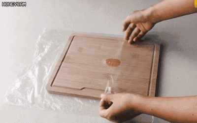然后在菜板正面也倒上几滴油,并用保鲜膜将菜板整块包裹起来,轻轻按压一下,让菜板正反面都浸入油脂中。