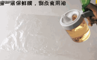 先将保鲜膜剪下一大块,平铺在桌上,倒上少量食用油,将油抹散后,放上一块干净干燥的木菜板。