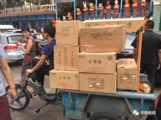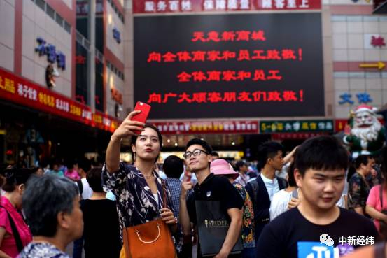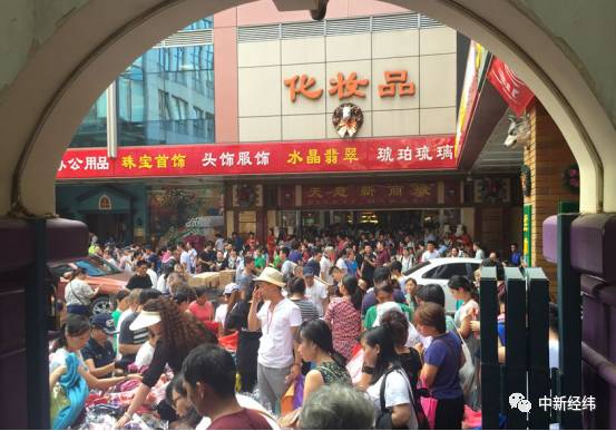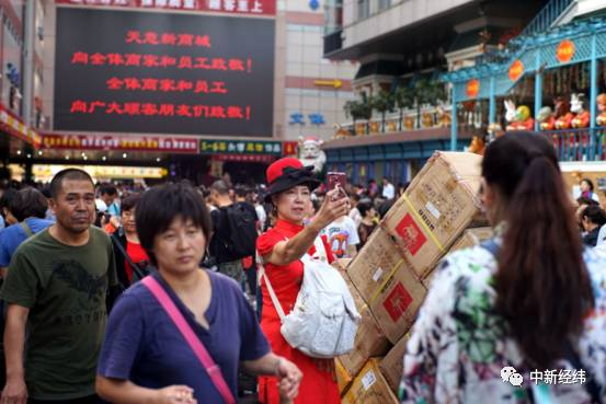 在天意门口标志性的十二生肖像地下,商户们一路排开,浴巾、丝巾、围巾等轻便商品被商户握在手里,挥臂叫卖。不时有往商场运货的三轮车穿梭于人群,透露着商户最后的商机。中新经纬(微信公众号:jwview)从运货人员得知,因为生意火爆,不少商家临时补货。