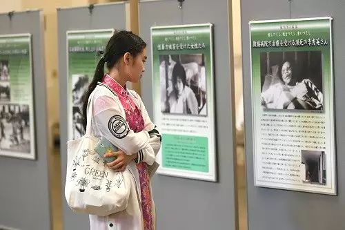 日本广岛,一名女子观看南京大屠杀史实展。 新华社记者华义摄