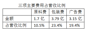 从单项费用来看,最多的是包装物3.79亿,其次是形象宣传推广费花去了3.15亿、原料费用了1.7亿。
