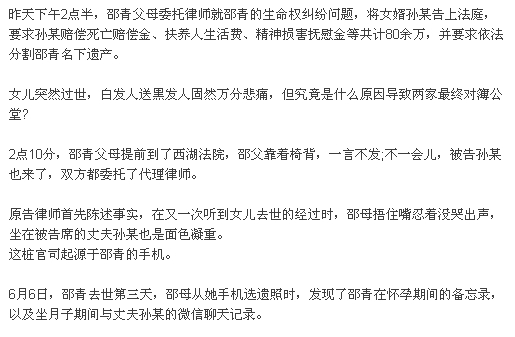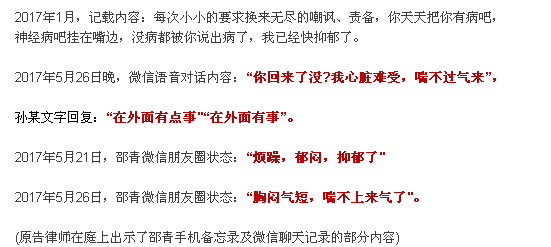 手机里的这些内容,让邵青父母认为,女儿的婚姻并不如表面所见的美满,恰恰相反,他们认为正是女婿孙某对女儿的长期冷落和言语攻击,才会让女儿长期处于精神抑郁的状态,并导致心脏猝死!