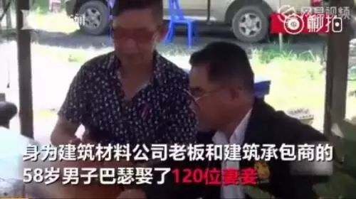 【泰国男子自曝娶妻120人 每周轮流宠幸"雨露均沾"】 泰国一名58岁的男子巴瑟,是一家建筑材料公司老板和建筑承包商,而他娶了120名妻妾,生了28名子女,他更称会每周每月轮流宠幸妻妾,不会嫌累。据悉,他17岁时娶了第1个老婆,连生3个孩子后就开始纳妾。他纳的妾都不超过20岁,因为他认为年纪大的容易顶嘴。
