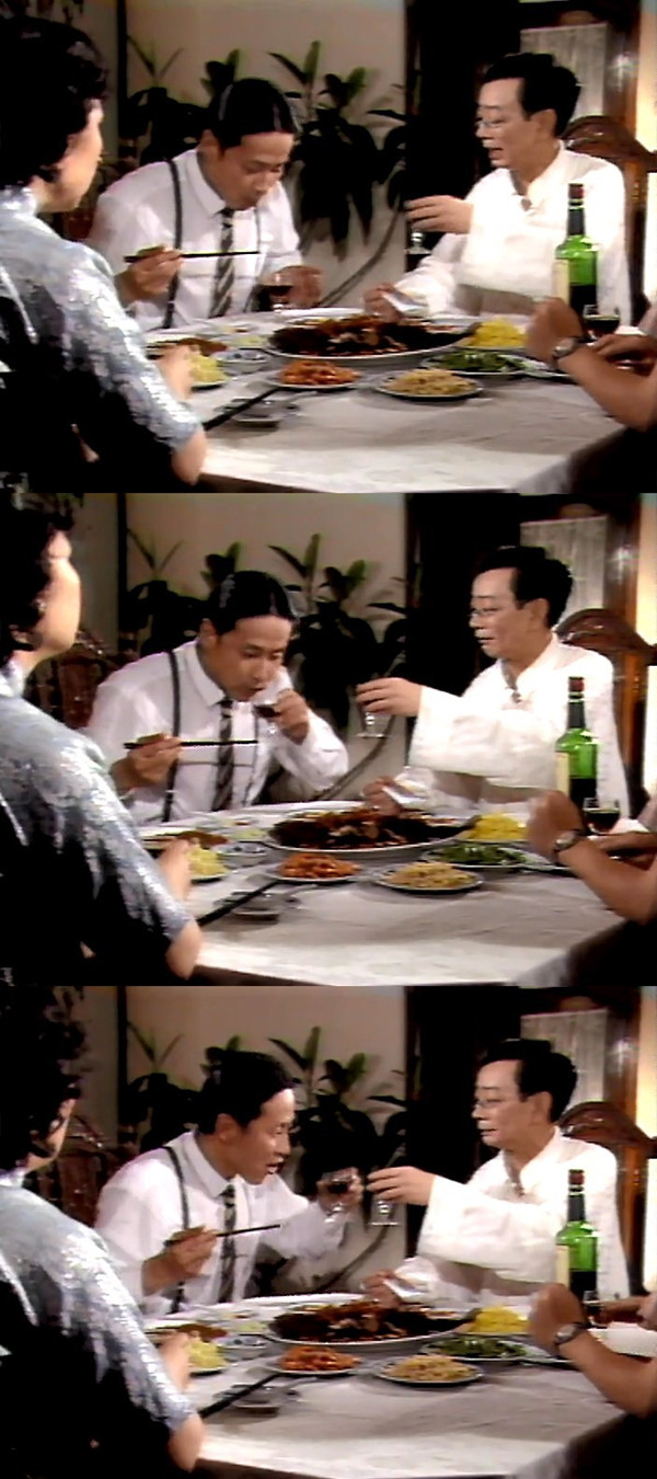 这个敬酒的动作在原著里是不曾有的,而电视剧给方鸿渐设计了这样一个小动作,方鸿渐满不在乎的心理就立刻立住了,陈道明的“一惊一乍”表演也就此开端。