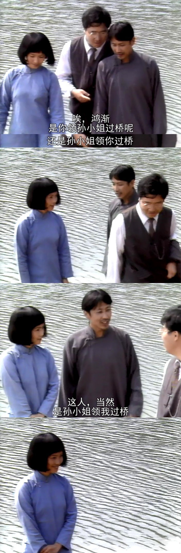 这一段心理描写一波三折,直把方鸿渐的花花肠子给抖了出来,但是如果要呈现出影像,那就只剩下了方鸿渐很“老实”地说:“是孙小姐领我过桥的。”全无书中对方鸿渐心理的刻画,对方鸿渐这个人物形象的塑造也打了折扣。