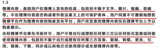 1.3 未经微博平台事先书面许可,用户不得自行授权任何第三方使用微博内容(微博内容即指用户在微博上已发布的信息,例如文字、图片、视频、音频等),包括但不限于自行授权任何第三方发表、复制、转载、更改、引用、链接、下载、同步或以其他方式使用部分或全部微博内容等。