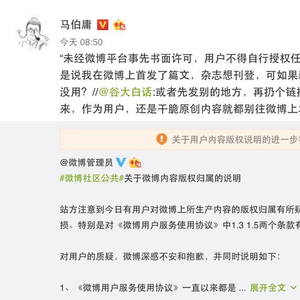 电商、品牌方面自媒体行业人士“万能的大熊”(真实姓名宗宁)在接受每日经济新闻(微信号:nbdnews)记者采访时表示,版权是作者的,但微博应该也有些权益,版权归创作人所有是毋庸置疑的,微博如果利用用户内容产生二次的商业价值,是应该和作者分成。