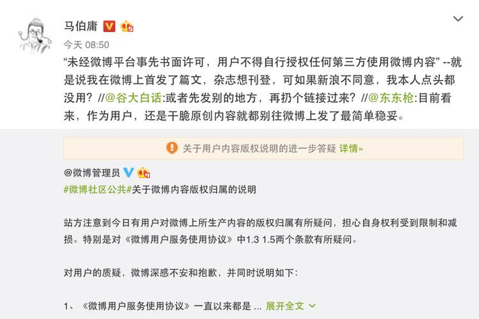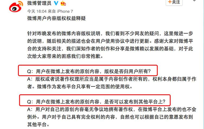 于是,9月16日下午,@微博管理员 再次发声,对大家提出的质疑进行了解答,并明确表示,“用户对自己的原创内容毫无争议地拥有著作权,在微博平台上发布的也不会例外。用户对于自己具有完全权利的内容,自然也可以根据自己的意愿发布到其他平台。”